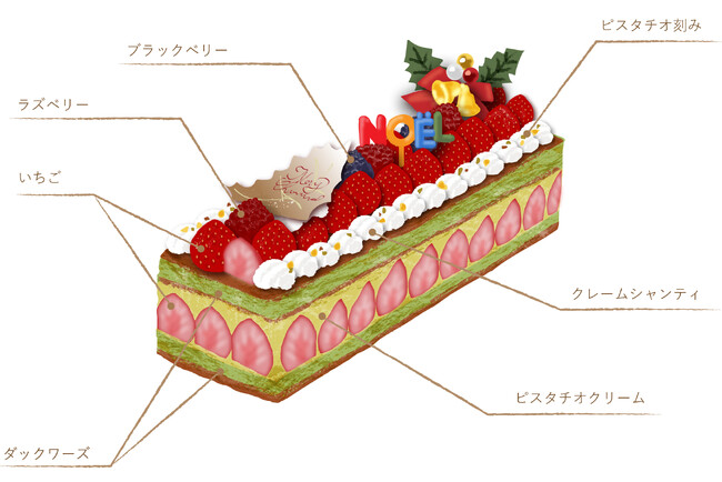 苺の季節を華やかに彩ってきた「フレジェ」をダイナミックなサイズとデコレーションのクリスマスケーキとしてご用意。ローストピスタチオのバタークリームとフレッシュストロベリーをピスタチオと抹茶のダックワーズで挟みます。濃厚に仕上げたピスタチオクリームと贅沢につかった甘酸っぱく瑞々しい苺の相性の良さを存分に楽しむ、クリスマスカラーの色合い華やかな一品です。