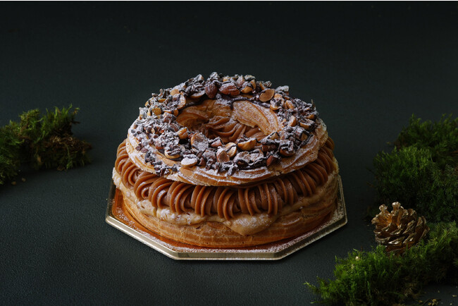 濃厚なヘーゼルナッツのプラリネクリームとアーモンド香るカスタードクリーム、そしてミニエクレアをリング型のシュー生地でサンドした、クリスマスリースをイメージさせるケーキです。たっぷりのアーモンドとヘーゼルナッツ、カカオニブの食感がアクセント。それぞれの素材が奏でる濃厚な味わいのハーモニーが人気のケーキです。