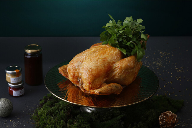 ホテルメイドの本格的なローストチキンをお手軽に楽しんでいただきたいというシェフの思いから生まれたローストチキンとソースのセットです。ストレスフリーの環境でのびのびと健康的に育った千葉県産の平飼い「錦爽とり」を使用。ホテル内で丁寧に時間をかけて焼き上げます。身の引き締まった味わい深いチキンによくあう、定番のグレービーソースと2種類のマスタードを添えてご提供いたします。