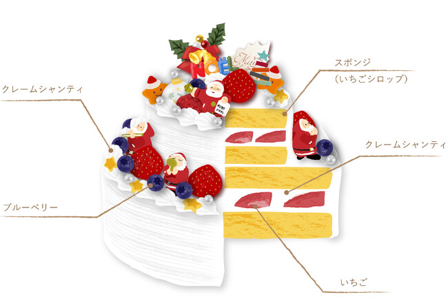 ストロベリーシロップを塗ったスポンジに純生クリームと大粒の苺をサンドした人気No.1のストロベリーショートケーキを2段にして重ね、大勢のサンタや雪だるまを飾り可愛らしく仕上げました。歓声が聞こえてきそうな華やかな一品です。