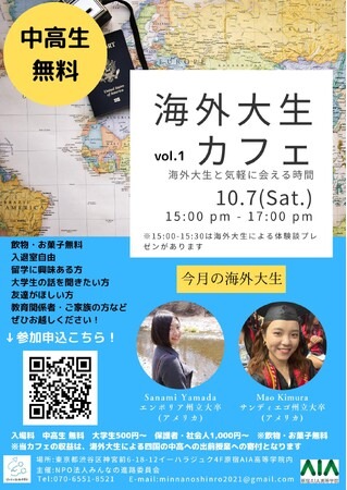 多様な進路を提案する特定非営利活動法人みんなの進路委員会が、多様な学びを実現する通信制サポート校の原宿AIA高等学院と協業し海外大生カフェを毎月第1土曜日に開催!