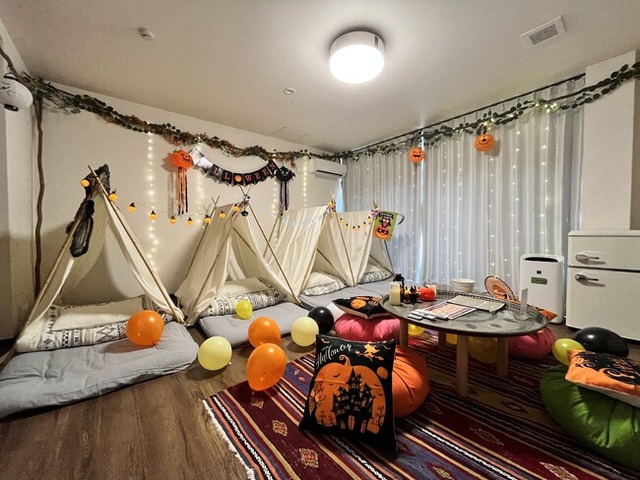 最大5名様まで宿泊可能なHEYAmpingルームが、かぼちゃ、コウモリ、ガイコツなどのハロウィンルームに変貌しました!友達、女子会やファミリーでのご利用におすすめのハロウィンを満喫するプランです。