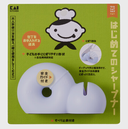 今回登場するシャープナーは、ドーナツ型の持ち手が小さな子どもの手でもにぎりやすい※子ども向けのシャープナー。リトルシェフクラブの本格刃付け包丁と一緒にお使いいただけます。「包丁は研ぎながら長く使う」という習慣や道具に対する愛着心を持ってもらうため、新しくラインナップに加わりました。にぎる場所を示した安全ガイド付き。包丁の切れ味を維持し、長く使うためのお手入れ道具としてご提案します。切れ味のよい包丁を使うことは安全性(けがをしにくい)にもつながり、料理をすることが楽しくなります。貝印は、今後も皆様の調理シーンを楽しく豊かにするアイテムをお届けし、充実したキッチンライフを提供してまいります。 ※意匠登録第1748130号