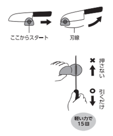 2.包丁の刃の形 (刃線)に沿って、ハンドルを傾けながら、軽い力でまっすぐ手前方向に引きます。