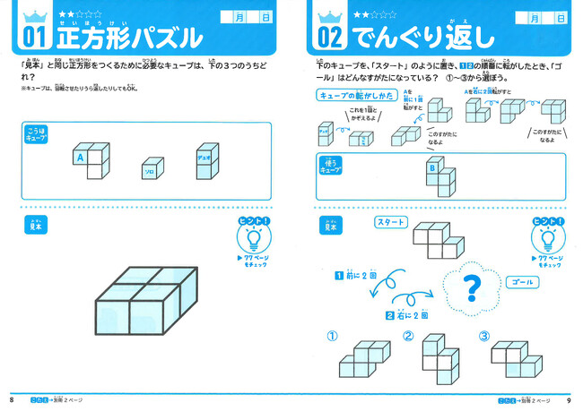 「立体図形入門」収録問題……「正方形パズル」「でんぐり返し」「この形はどれ?」「穴はどこ?」「階段」「おしくらまんじゅう」「ふたご」「設計図」「立方体パズル」「転がりスタンプ」「ふたご仲間はずれ」「いす」「きみの席はどこ?」「どこでくっつく?」「宅配便」「切り口は?」の16種類、全68問