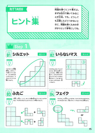 「わからない問題にぶち当たったとき、解答を見るのは負けた気がする!」「問題は自力で解ききりたい!」など……そんながんばりやを応援すべく、巻末に「ヒント集」を設けました。答えを導き出すために注目したい点や、解きかたの手順などを記載していますので、いきなり答えではなく、まずは問題の着眼点を知りたいというときに、ぜひ活用してください。自力で問題を解く経験の積み重ねによって、自然と発見力、論理力、意志力などが養われます。