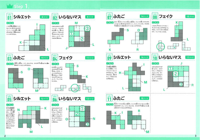 「平面図形入門」収録問題……「シルエット」「いらないマス」「ふたご」「フェイク」「しきつめ」「通り道」「三つ子」「投影図」の8種類、全66問