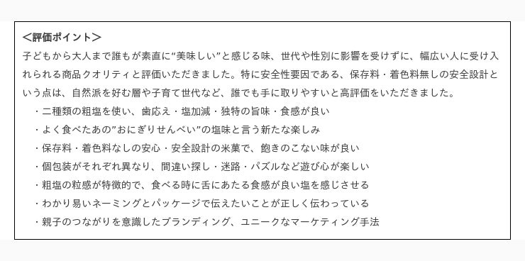 「おにぎりせんべい銀しゃり」はおかげさまで今年発売11周年を迎えることができ、今回の光栄な賞をいただくこともできました。今後も、親から子へ、そして孫にも愛される商品をお届けするとともに、「お菓子の楽しさ」を発信して参ります。