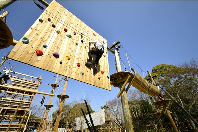 アスレチック「アッパレ!戦国大冒険!」初級コースのボルダリングゾーンのホルダーが変更。映画「クレヨンしんちゃん もののけニンジャ珍風伝」に登場した「タコ・カメ・ゴリラ」をイメージした可愛いホルダーが登場し、踏むと音が鳴る仕掛けを追加、などさらに可愛く難しくなった初級コースを体験できる