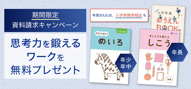 今なら、資料をご請求いただいた方全員に、実際の教材がためせる「おためし教材」に加えて、お子さまの思考力を鍛えるワーク教材を無料で差し上げています。
