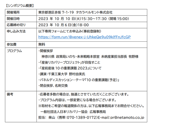 産後の課題を社会化すべく、産前産後に関わる方々への大規模調査の結果から『産前産後 10の重要課題2023』を作成、社会啓発活動の一つとしてシンポジウムを開催します。