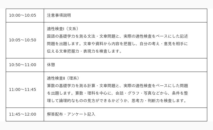 過去に出題された適性検査の問題を分析し、基礎学力と思考力・判断力・表現力を問う、栄光オリジナルの問題を出題します。普段のテストとは考え方や解き方が異なる本番さながらの模試で、「適性検査とはどのようなものか」を体感できます。