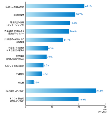 SDGs教育の内容については、「生徒による自由研究」、「地域の探究」、「職場見学・体験(インターンシップ)」、「外部講師・企業による講演会やセミナー」、「外部講師・企業による出張授業」など様々な取り組みを実施している一方で、SDGs教育で何をするか「特に決まっていない」(26.4%)、「SDGs教育は実施していない」(19.9%)という回答も2割程度みられ、学校におけるSDGs教育環境に格差が生じているようです。