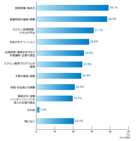 SDGs教育に取り組む際に教員が思う課題は、「授業準備・進め方」(39.1%)、「授業時間の確保・調整」(38.4%)、「SDGs指導経験・スキルの不足」(31.1%)という授業を行う環境や教員自身の経験・スキルなどが課題として上位にあげられ、次に「生徒のモチベーション」(28.6%)、「出張授業・講演会を行なう外部講師・企業の選定」(25.8%)、「SDGs教育プログラムの開発」(24.9%)といった生徒の意識や外部講師・企業との調整などがあげられました。