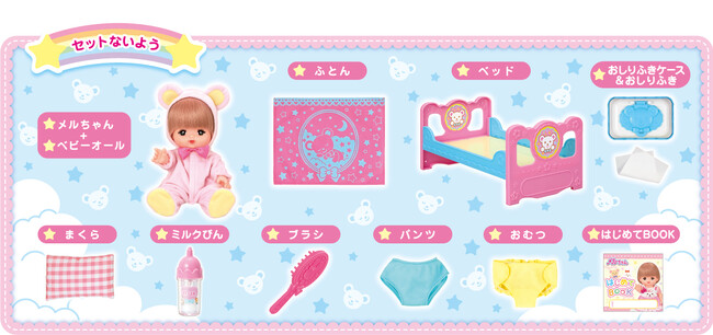 セット内容 :ショートヘアメルちゃん、ベビーオール、 パンツ、ベッド、おふとん、まくら、おしりふき、