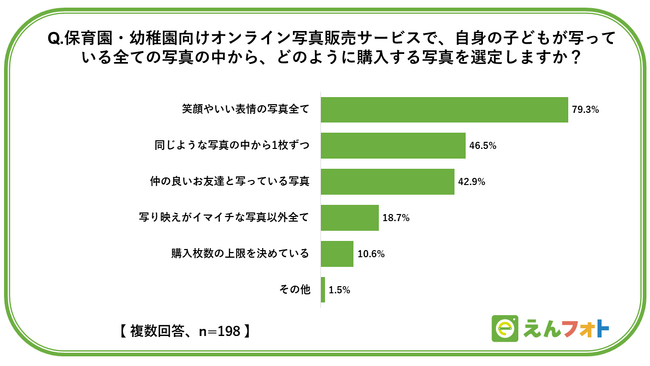 現在、保育園・幼稚園向けオンライン写真販売サービスを導入している施設に通園中の子を持つ親の約8割が、「笑顔やいい表情の写真全て」(79.3%)を購入写真選定時に基準にしていることがわかりました。次いで「同じような写真の中から1枚ずつ」(46.5%)、「仲の良いお友達と写っている写真」(42.9%)という結果となりました。