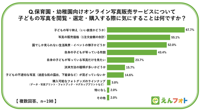 現在、保育園・幼稚園向けオンライン写真販売サービスを導入している施設に通園中の子を持つ親が、サービスを利用し子どもの写真を閲覧・選定・購入する際に気にすることは、「子どもの写り映え(いい表情かどうか)」が67.7%と最も多く、次いで「写真の販売価格(1注文金額の合計)」(55.1%)、「園でしか見られない生活風景・イベントの様子かどうか」(52.0%)となりました。