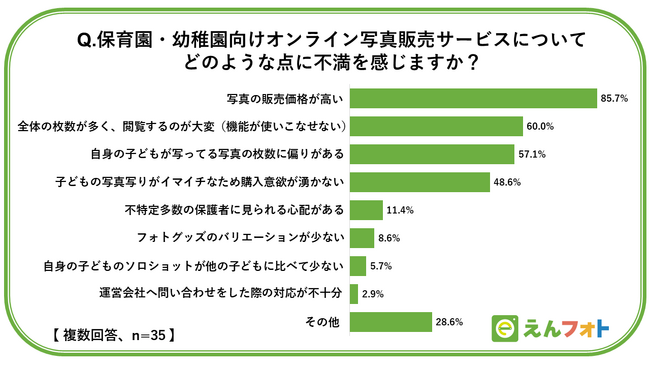 現在、保育園・幼稚園向けオンライン写真販売サービスを導入している施設に通園中の子を持つ親が、サービスの利用にあたって不満を感じていることは、「写真販売の価格が高い」(85.7%)が最も多い結果となりました。次いで、「全体の枚数が多く、閲覧するのが大変(機能が使いこなせない)」(60.0%)、「自身の子どもが写っている写真の枚数に偏りがある」(57.1%)という結果となりました。