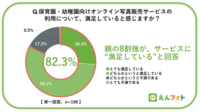 現在、保育園・幼稚園向けオンライン写真販売サービスを導入している施設に通園中の子を持つ親の82.3%が、サービスの利用について「満足している」と回答しました。