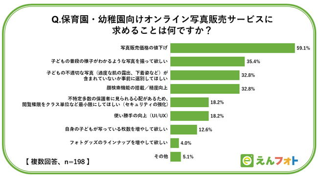サービスに求めることは「写真販売価格の値下げ」が59.1%で最も多い結果に。子どもの不適切写真の事前選別を求める親は3割強(32.8%)。<結果5>