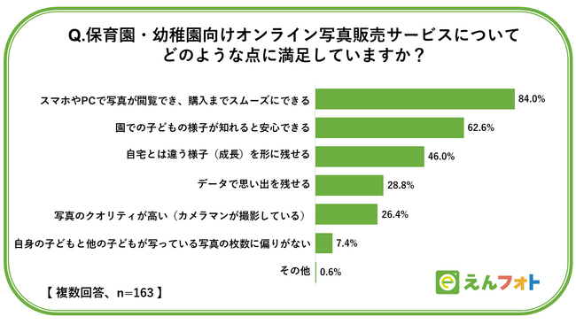 現在、保育園・幼稚園向けオンライン写真販売サービスを導入している施設に通園中の子を持つ親が、サービスの利用に対して満足していることは、「スマホやPCで写真が閲覧でき、購入までスムーズにできる」(84.0%)が最も多く、次いで、「園での子どもの様子が知れると安心できる」(62.6%)、「自宅とは違う様子(成長)を形に残せる」(46.0%)となりました。