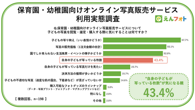 しかしながら保育園・幼稚園での子どもの様子(写真)が手軽に閲覧・購入できるようになった一方で、「自身の子どもが写っている写真の枚数に偏りがあること」に不満を感じていたり、子どもの写真を閲覧・選定・購入する際に気にしたりする親が一定数いることも判明しました。