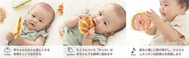 「赤ちゃんが遊ぶ姿が可愛く、それを見た周囲の人たちが笑顔になり、さらに赤ちゃん自身も笑顔になる、という笑顔の循環を生むようなおもちゃが欲しい」という声をきっかけとして開発がスタートし、本物そっくりな食べ物をモチーフとして選定を行いました。