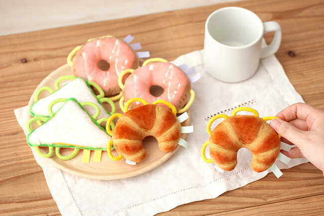 素材:《サンドイッチ》ポリエステル、ポリウレタン、ポリスチレン、綿、ナイロン 《クロワッサン・ドーナツ》ポリエステル、ポリスチレン、綿、ナイロン