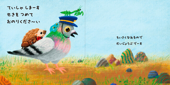 はとの車掌さんの背中に乗って、野原の仲間たちが一緒におさんぽです。まるた駅からはカブトムシくん、みずべ駅からはカエルくんが乗車しま~す。いつの間にか車掌さんの背中はぎゅうぎゅう詰めです。みんな仲良くおさんぽできるかな? 小さな生き物たちの優しい言葉が、思いやりの気持ちを育みます。「しゅっぽっぽ」とリズムよく、何度も読みたくなる絵本です。