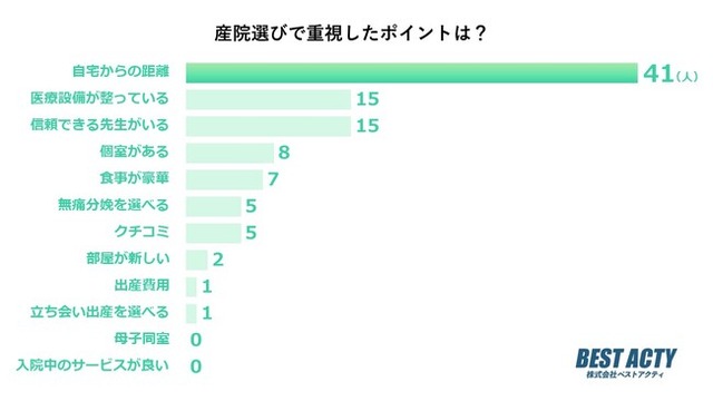 産院選びで重視したポイントについて100人にアンケートを行ったところ、「自宅からの距離」と回答する人が最も多い結果となりました。