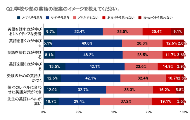 Q1・Q2では、子どもが英会話スクールや英語塾に通っていたが英語力アップの効果を感じていない人が一定数いること、学校や塾の英語の授業に対して明確な効果や良い印象を持てていない人が多いことが明らかになりました。