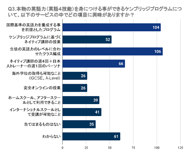 Q3で「本物の英語力(英語4技能)を身につける事ができるケンブリッジプログラムについて、以下のサービスの中でどの項目に興味がありますか?(複数回答可)」と質問したところ、静岡県で最も多かったのは「生徒の英語力のレベルに合わせたクラス編成」で106名でした。次いで、「国際基準の英語力を養成する事を前提としたプログラム」には104名、「ネイティブ講師の週4回+日本人トレーナーの週1回のパーソナルトレーニング」には66名が興味を持っています。一方で、「海外学位の取得も可能なこと(IGCSE、A-Level)」や「完全オンラインの授業」に関心を持つ人はやや少なめで、26名の回答でした。これらの結果から、多くの人は実用的な英語力の養成や個別のニーズに応じた指導に重きを置いていることが伺えます。