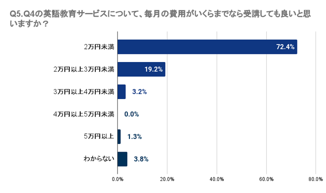Q3・Q4では、「本物の英語力(英語4技能)を身につける事ができるケンブリッジプログラム」について、73.2%の人が興味があるまたは受講したいと回答し、サービス内容では国際基準の英語力の養成や個別のニーズに応じた指導に興味があることが分かりました。さらに、Q5では91.7%の人が3万円未満の金額で受講したいと考えていることが分かりました。