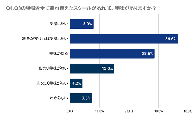 Q4で「Q3の特徴を全て兼ね備えたスクールがあれば、興味がありますか?」と質問したところ、静岡県では8.0%が受講を希望し、36.6%は料金が手頃であれば受講したいと考えています。さらに、28.6%は興味を示していると回答しました。多くの人がこのような特徴を持つスクールに一定の興味を示していることが分かります。