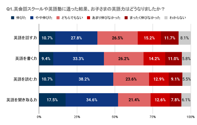 Q1で「英会話スクール、英語塾に通った結果、お子さまの英語力はどうなりましたか?」と質問したところ、静岡県では英会話スクールや塾に通って英語のスキル向上を明確に感じられなかったと感じている人が一定数いることが分かりました。具体的には、英語を話す、書く、読む、聞き取る各スキルにおいて、「伸びた」と感じる人は9.4%~17.5%であり、一方で「あまり伸びなかった」や「まったく伸びなかった」と回答した人が合わせて20.4%~26.9%となっています。特に、「英語を話す力」と「英語を書く力」においては「あまり伸びなかった」と「まったく伸びなかった」の合計がそれぞれ26.9%、25.2%となっています。また、各スキルに関して「どちらでもない」と答えた人も含めると、41.7%~53.4%となっており、明確な効果を実感していない人が一定数存在することが伺えます。