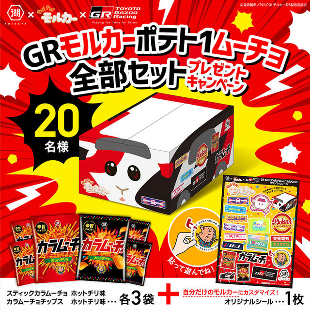 株式会社湖池屋(本社:板橋区/社長:佐藤章)は、1984年発売の「カラムーチョ」のパッケージのキーカラーである「赤」と「黒」がTOYOTA GAZOO Racingのボディーカラーと似ていること、また、味名の「ホットチリ」がTOYOTA GAZOO Racingが参戦するWRC(FIA世界ラリー選手権)Rd.11の開催地の「チリ」と“チリ”の文字が共通すること、そして、「カラムーチョ」をお届けすることで“チリ”を“ホット”に盛り上げ、TOYOTA GAZOO Racingを応援したいとの想いから、2022年8月23日の「湖池屋ポテトチップスの日」に助けにきてくれたPUI PUI モルカーの「ポテト」にご協力いただき、湖池屋×TOYOTA GAZOO Racing×PUI PUI モルカーがまさかの大合体を果たした「GRモルカーポテト1ムーチョ」全部セットプレゼントキャンペーンを、TOYOTA GAZOO Racingが参戦するWRC(FIA世界ラリー選手権)Rd.11のスタート日である2023年9月28日(木)より実施します。