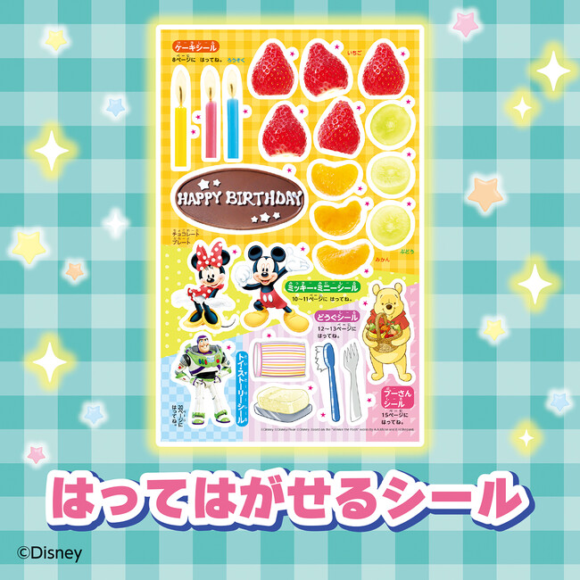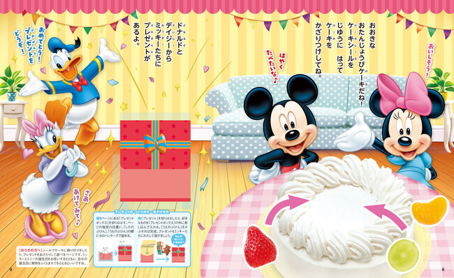 はってはがせるシールを使って、ミッキー・ミニーのお誕生日ケーキの飾り付けができます。ミッキー・ミニーへプレゼントを渡して遊ぶことができるしかけも。