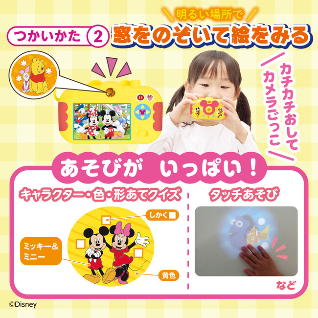 夜、寝る時間になっても、お子さんが、なかなか寝室に行きたがらない…ってこと、ありますよね。そんなときは、「カメラでミッキーをうつそう!」などと話して、寝室に誘ってみましょう。寝かしつけのアイテムとしても、ぜひお役立てください。