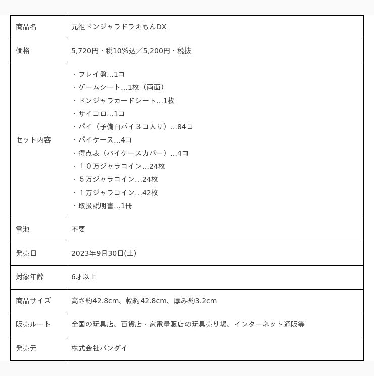 株式会社バンダイ トイディビジョンは、今年でシリーズ43周年を迎えるファミリーゲーム「ドンジャラ」シリーズの最新作として『元祖ドンジャラドラえもんDX』 (5,720円・税10%込/5,200円・税抜)を、2023年9月30日(土)より全国の玩具店、百貨店・家電量販店の玩具売り場、インターネット通販等にて発売いたします。(発売元:株式会社バンダイ)