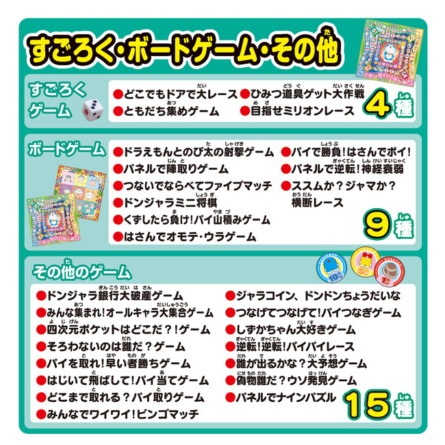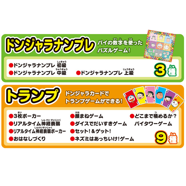 定番の「ドンジャラ」の他に、ひみつ道具のパイを自分の番に捨てると特殊効果を得られる特別ルール「ひみつ道具でドンジャラ」や、すごろくと「ドンジャラ」を組み合わせたゲーム「すごろくドンジャラ」など、「ドンジャラ」シリーズ最多となる全60種のゲームを遊べます。