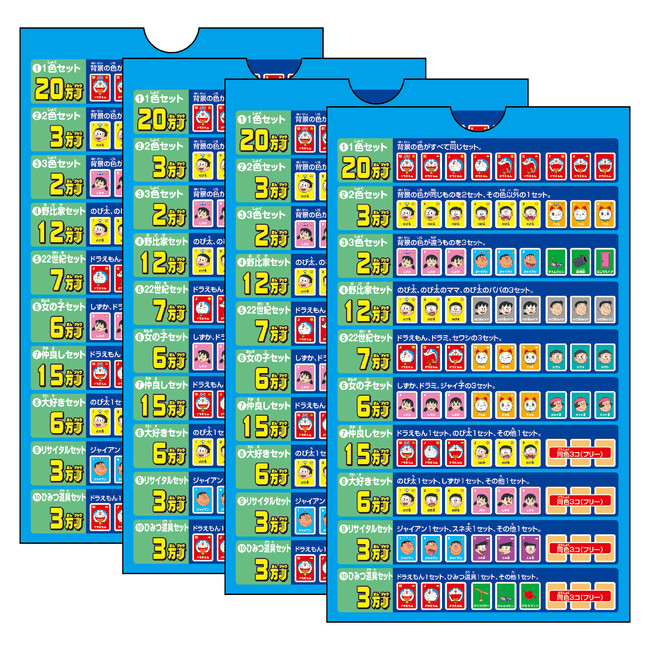 役の種類は「1色セット」「3色セット」などのパイの色で揃えるものや、「野比家セット」「22世紀セット」といったキャラクター同士の関係をモチーフにしたものなど様々で『ドラえもん』の世界観を楽しみながら「ドンジャラ」で遊ぶことができます。