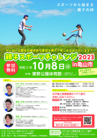 特定非営利活動法人三重県生涯スポーツ協会(津市、理事長 竹田昌平)と三幸・スポーツマックス共同事業体(統括責任者 奥川清美)は、毎年好評の「親子スポーツチャレンジin亀山市」を10月8日(日)に亀山市の東野公園体育館で開催します。子どもへのスポーツ指導の専門家からサッカーや野球の基本練習を学びながら、親子で楽しみながら取り組みます。