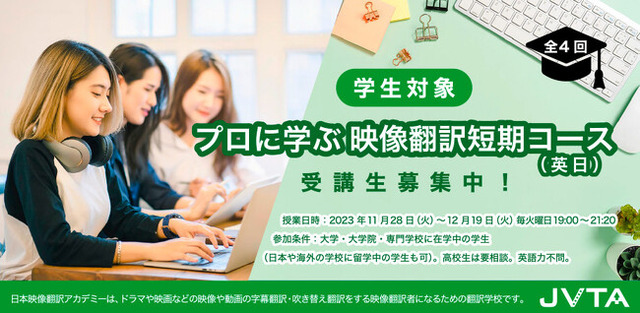 日本映像翻訳アカデミー株式会社(本社:東京都中央区、代表取締役:新楽直樹、以下「JVTA」)は、大学・大学院・専門学校の学生を対象に英語から日本語の字幕翻訳をレクチャーする短期コース「学生対象 プロに学ぶ映像翻訳短期コース(英日)」を2023年11月28日(火)より開講します。教育機関での授業やJVTAが行う単発セミナー以外で、学生を対象とした専門コース開講はJVTAにおいて初となります。