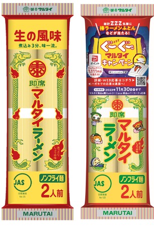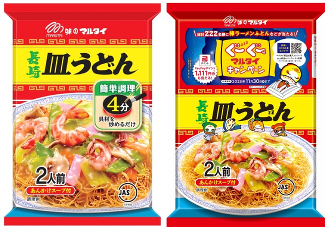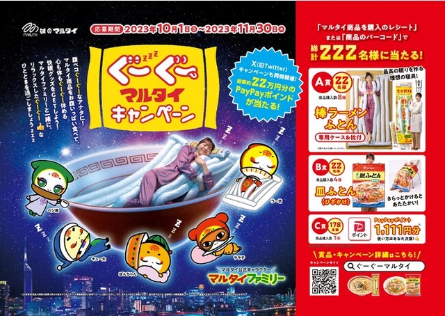 棒ラーメンと長崎皿うどんでおなじみ株式会社マルタイ(本社:福岡市西区今宿青木)は、マルタイ商品をお腹いっぱい食べて、心も体もぐーぐー休める快眠グッズが当たる「ぐーぐーマルタイキャンペーン」を2023年10月1日(日)から開催中です。「棒ラーメンふとん(専用ケース&枕付) 」や「皿ふとん(ひざかけ)」など快眠をサポートする賞品や「PayPayポイント※1,111円分」が合計222名様に当たります。※出金・譲渡不可※応募はおひとり様何度でも可