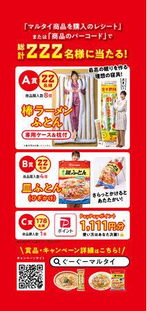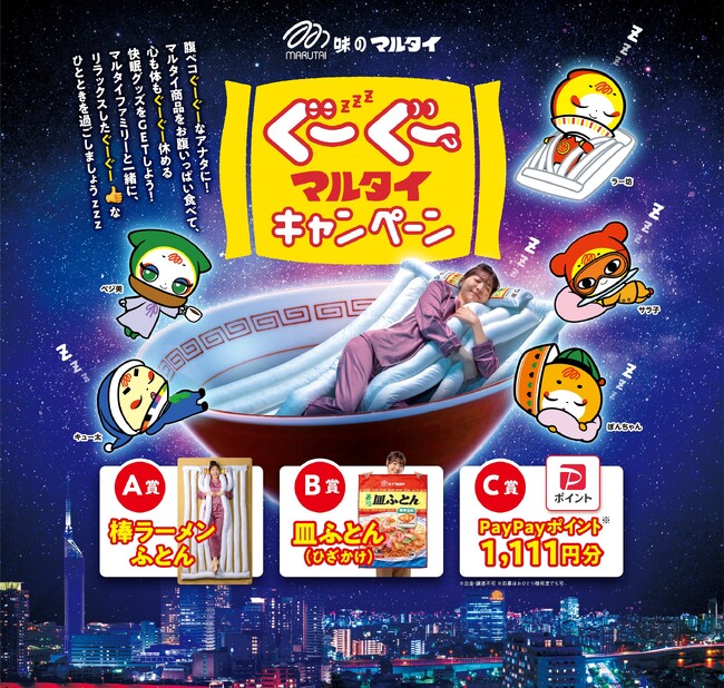 今回のキャンペーンタイトル“ぐーぐーZZZ”は、「寝る」と「食べる」の幸せ要求を満たすタイトルです。“腹ペコのぐーぐー ”、 “睡眠のぐーぐー ”、そして“マルタイがgoodでぐーぐー!”の3つの意味をぐぐっと詰め込んでいます。棒ラーメンをはじめとするマルタイ商品をお腹いっぱい食べ、心も体もゆっくり休めるあったか快眠グッズで、マルタイファミリーと一緒に、リラックスしたぐーぐーなひとときを過ごしていただきますZZZ
