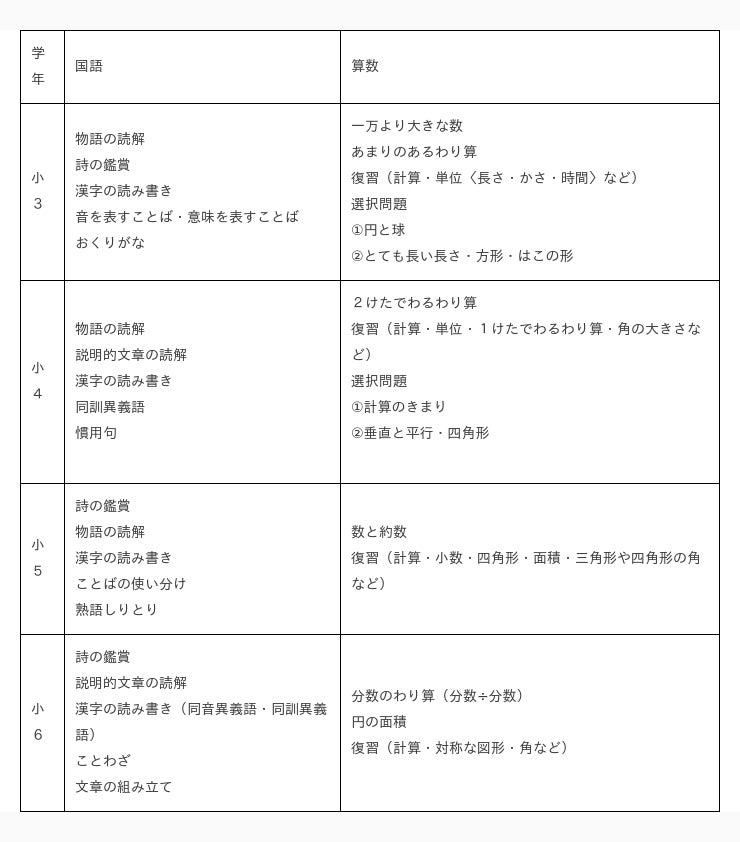 出題範囲 学年ごとにテストの出題範囲が決まっています。