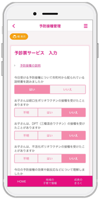 さらに「予防接種デジタルサービス」では、名前と住所の入力は利用開始時のみとなり、複数接種の場合は問診項目も統合利用されるため、保護者は同じ内容を記載する手間が省けるほか、医療機関はワクチンごとの接種期間や前回からの接種間隔による接種可能判定をデジタルにより安全かつ効率よく確認することができます。今後も、より簡単に手続きできる仕組みの整備と一人ひとりに合った切れ目のない支援を行うことで、子育て世帯の負担や不安を解消し、便利で安心・安全な子育て環境づくりを推進します。