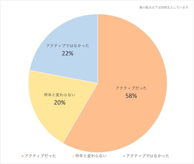 ただし、2023年がアクティブではなかったというわけではなく、2021年以前がコロナの自粛ムードであったため、”前年対比”という観点では2022年のアンケートの方がアクティブになったと感じる人の割合が多かったのだろう。