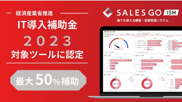 これにより「IT導入補助金2023」において補助対象となる中小企業・小規模事業者様が「SALES GO ISM」を導入する際に、月額費用の最大50%、2年間で最大150万円の補助金を申請することが可能になりました。