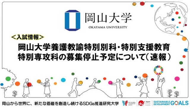 国立大学法人岡山大学(本部:岡山市北区、学長:那須保友)で実施している「養護教諭特別別科・特別支援教育特別専攻科」について、募集停止予定となりました。